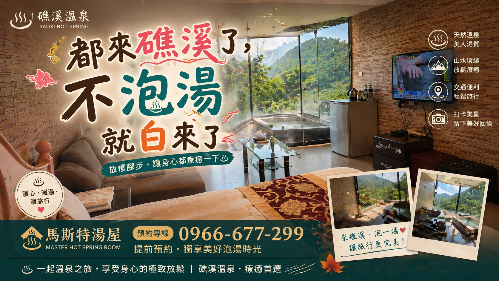 馬斯特湯屋|礁溪泡湯首選位於礁溪的 馬斯特湯屋,提供高品質 礁溪溫泉、礁溪湯屋、礁溪泡湯 體驗,專為情侶、朋友或短暫休息旅客設計。無需住宿即可享受 泡湯兩人兩小時 或 延長至 3 小時泡湯 的舒適時光,房內配備私人湯池、雙人床、MOD 電視、冷氣、毛巾、洗沐用品及茶包飲品,打造私密又高 CP 值的 情侶湯屋 體驗。湯屋位於礁溪核心區,方便旅客順遊 礁溪景點,品嚐在地 礁溪美食。無論是約會、好友聚會或短暫放鬆,馬斯特湯屋都是 礁溪泡湯不住宿 的最佳選擇,讓你在天然溫泉中徹底放鬆身心,享受專屬的私密泡湯時光。